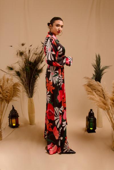 Kırmızı Çiçek Sepeti Kuşaklı Elbise
