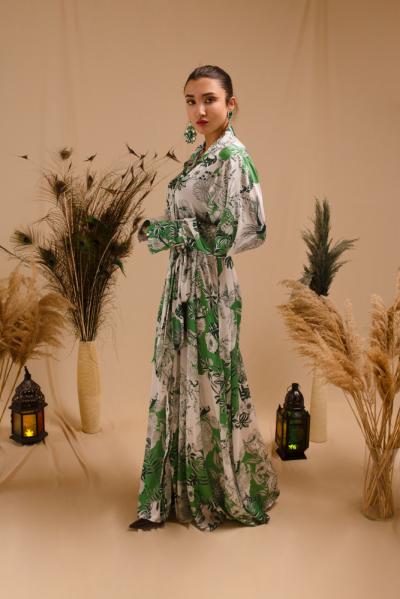 Yaprak Desenli Zümrüt Yeşili Kuşaklı Elbise