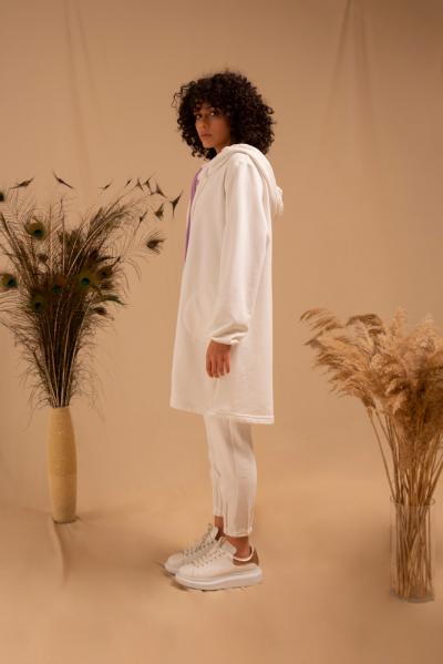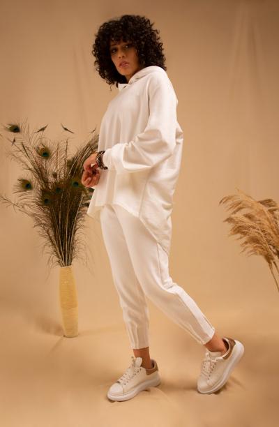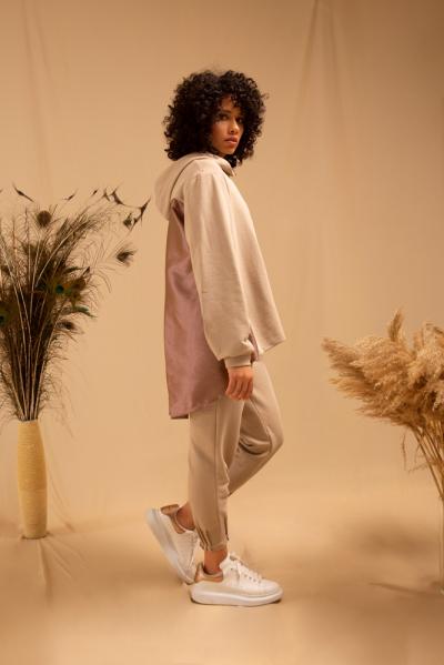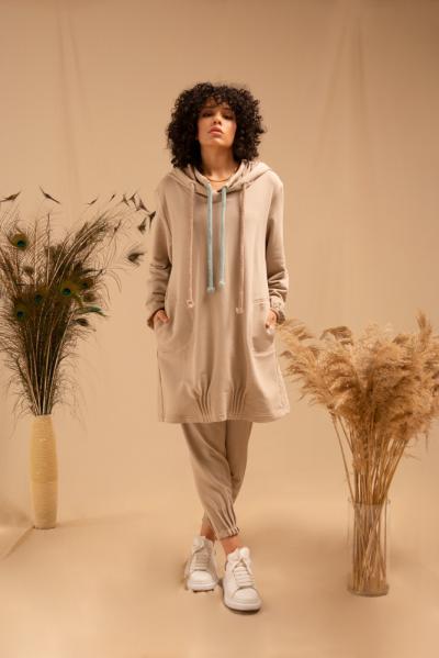 İpli Kapüşonlu Ekru Eşofman Üstü