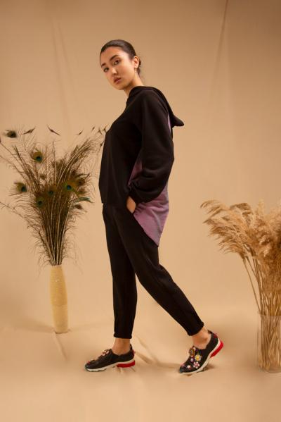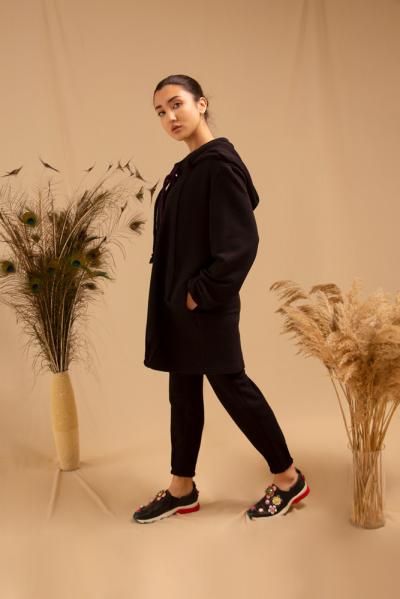 İpli Kapüşonlu Siyah Eşofman Üstü